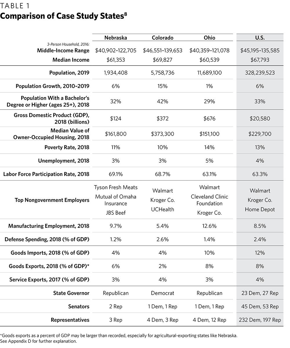 Yet Nebraska is more than just an ag state or a red state. More than half the state’s population now lives in the Lincoln and Omaha metropolitan areas—two areas that have become increasingly cosmopolitan and remain politically diverse.3 In these areas, banking, financial services, insurance, state government, transportation, healthcare, and universities anchor modern, diversified economies.4 And in the last decade, Lincoln and Omaha have boasted some of the highest rates of refugees per capita in the nation.5 In 2008, president Barack Obama picked up one of the state’s five electoral votes by winning the second congressional district, where Omaha is located. Nebraska and Maine are the only two states where it is possible for electoral votes to be split among multiple presidential candidates.6 And Nebraska is the only state with a unicameral, nonpartisan state legislature.7 It is indeed a unique state, yet at the same time, its population growth, levels of postsecondary education, and percentage of workforce in manufacturing all approximate the national average (see Table 1).