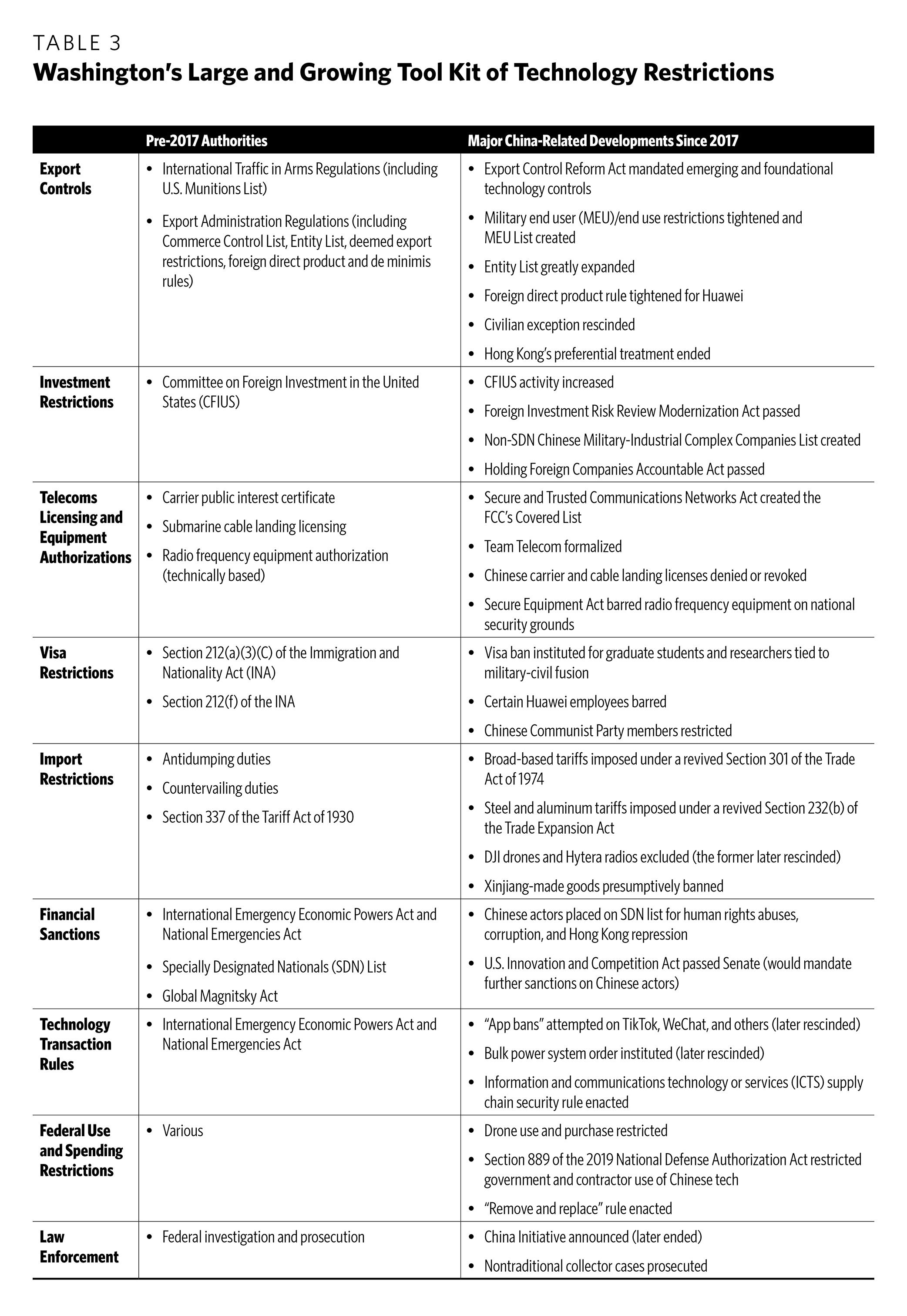 Under U.S. law, officials have vast discretion to impose technological decoupling. They need only invoke pliable concepts like “national security” or “the public interest” to restrict how technology products, services, and inputs move between America and China. Most restrictive powers have been used to a small fraction of their full decoupling potential. At the same time, restrictive authorities are fragmented across multiple agencies and policy domains. This combination of great power and great complexity increases the risk that U.S. technology controls will be poorly conceived or work at cross-purposes. It is therefore essential to develop a government-wide strategy that can prevent overreach and align disparate elements into a coherent whole.